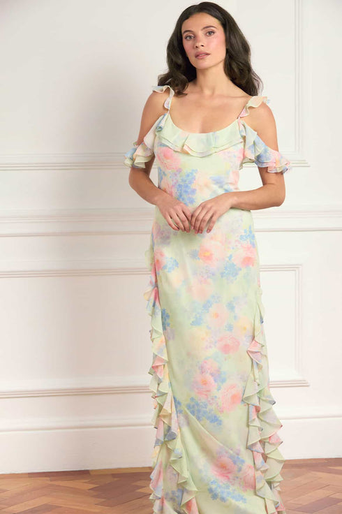 NEW SEASON. The Peony Bloom Georgette Cami Gown in Peppermint. Featuring a signature floral print inspired by an early 1900s hand-painted wallpaper, this gown showcases romantic peony bouquets and trailing daisies. Cut on the bias for a fluid drape that effortlessly skims the body, finished with a delicate cami silhouette.