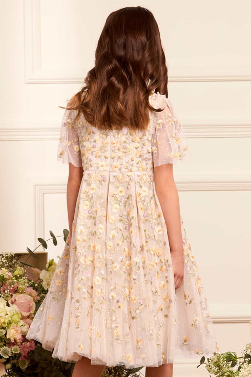The Posy Pirouette Kids Prom Dress in Cream showcases intricate embroidery inspired by the ‘summer posy’ print, with delicate florals scattered across the bodice and flowing towards the hem. The generous layers of net and tulle create a sweeping, voluminous skirt, making it an ideal choice for special occasions.