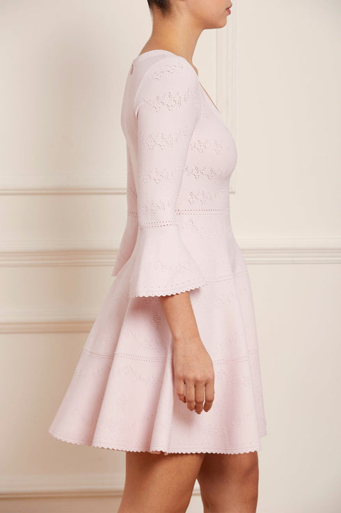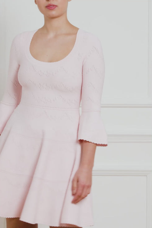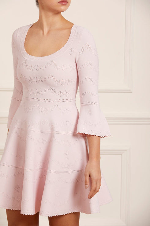 The Pretty Pointelle Knit Scoop Neck Mini Dress in Pink. A brand new style for Needle & Thread. This knitted dress is inspired by vintage ditsy florals and lace. Beautifully designed with all-over pretty pointelle stitch, delicate florals and scallop details. This dress has a fitted stretch bodice with a soft, feminine neckline, fluted cuffs and signature Needle & Thread detailing. A truly flattering piece.