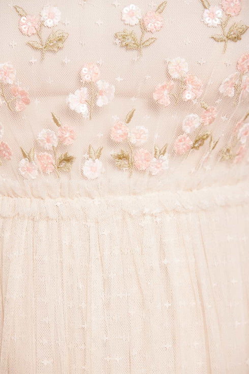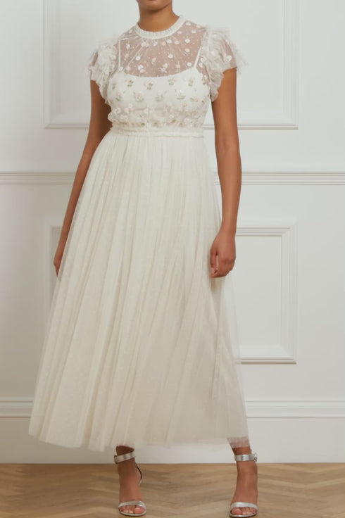 The Rococo Bodice Ankle Gown in Cream. A Needle & Thread signature archive style. The bodice of this gown is embellished with intricate floral motifs, highlighted with shimmering sequins. Inspired by flamboyant Rococo fashion with sheer sleeves adding romantic texture. The skirt is developed with layers of signature Needle & Thread soft tulle for a statement look. Dance the night away with the perfect level of shine.