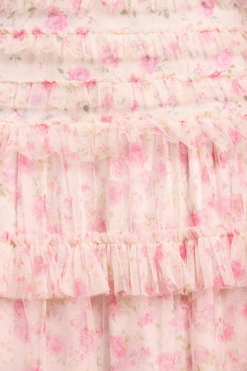 The Rose Ditsy Short Sleeve Ankle Gown in Moonshine/Pink. This gown features a romantic floral print inspired by 1800s hand-painted wallpaper. The slim silhouette is shaped with two layers of stretch power-mesh for comfort and support. Crafted with delicate tulle sleeves and skirt add to its ethereal charm, while signature Needle & Thread frills create a flattering, flowing effect. The square neckline, fluted sleeves, and gathered skirt bring elegance and timeless beauty to this gown. A piece you'll cherish forever.
