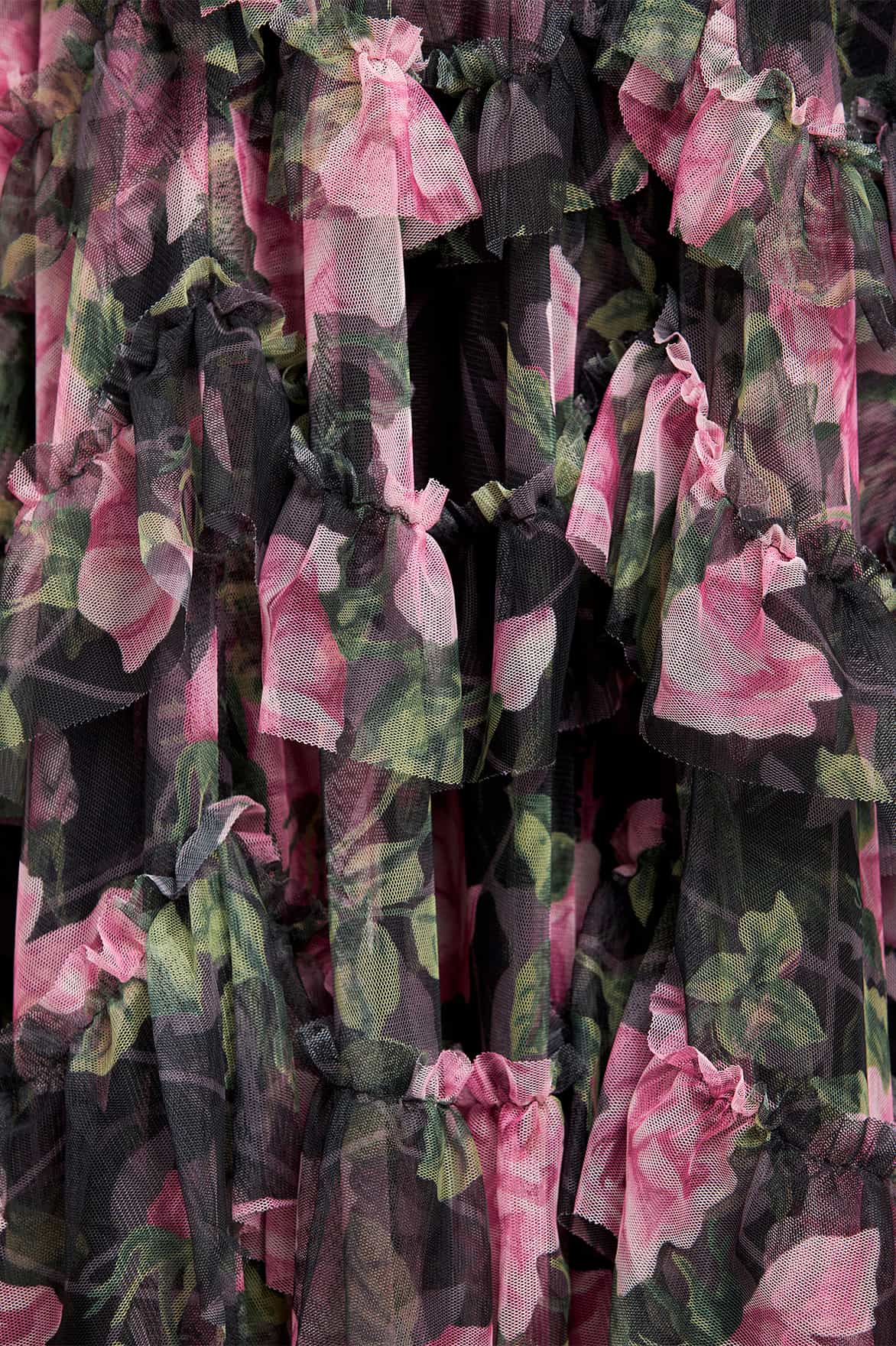 - Printed tulle decorated with tulle ruffles.