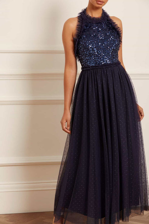 The Sequin Wreath Bodice Halter Neck Ankle Gown in Navy. This beautiful gown is crafted with an elegant halter neck shape and backless design. Designed with a signature Needle & Thread layered tulle skirt and tulle frills. The bodice of the gown is adorned with rich, shimmering sequins in a floral artwork. Shine under the spotlight in this magical style.