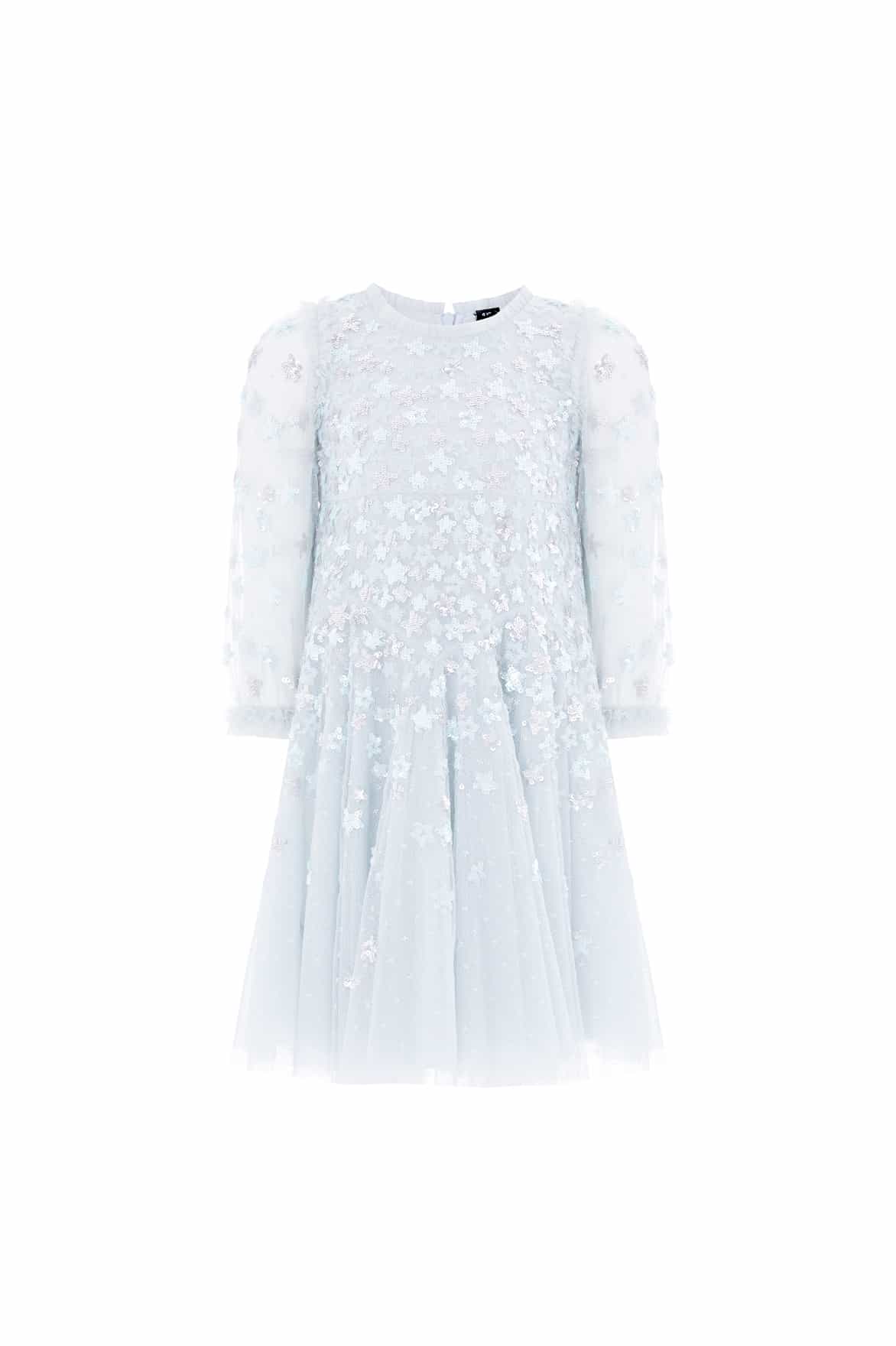 NEW SEASON. The Starry Nights Kids Dress in Ice Blue. Features twinkling star sequins cascading across soft tulle. With a full, gathered skirt and a gentle sparkle, it’s made for moments that feel truly magical. This dress pairs beautifully with the Starry Nights Round Neck Gown from the womenswear line for a timeless coordinated look.