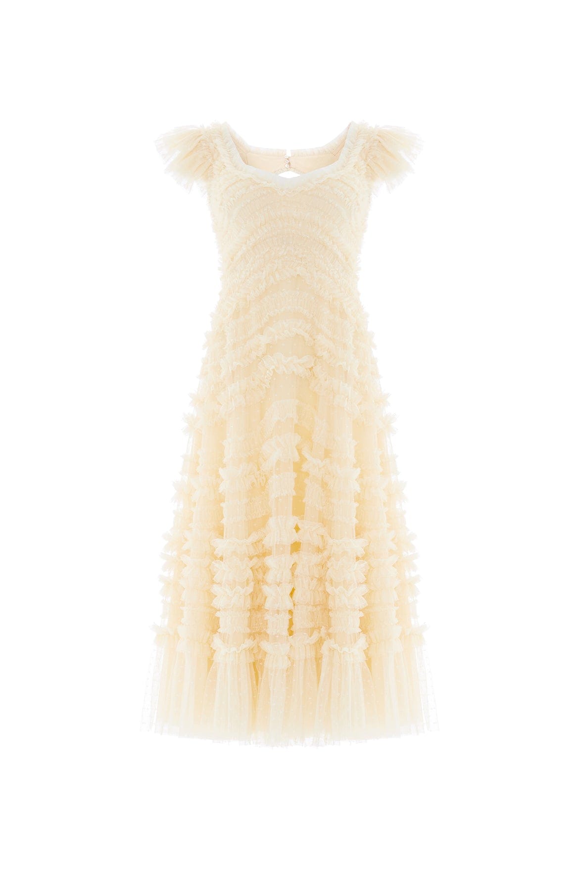 NEW SEASON | NEEDLE & THREAD EXCLUSIVE. The Amara Backless Ballerina Dress in Lemon Sorbet. Inspired by dreamlike English gardens featuring softly curved ruffle bands flowing across the body and into a voluminous ballerina-length skirt. Designed with a statement open back and signature frothy frilled shoulders, this silhouette moves beautifully with every step.