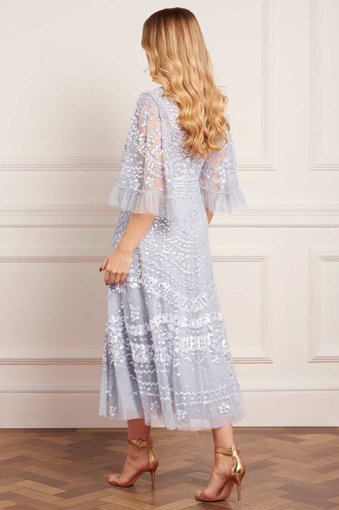 NEW SEASON | NEEDLE & THREAD EXCLUSIVE. The Anais Sequin Ballerina Dress in Skylight. A romantic statement piece adorned with shimmering sequin artwork inspired by vintage French lace. Crafted from soft tulle, this style features delicate fluted sleeves and gentle frill detailing, creating graceful movement with every step.