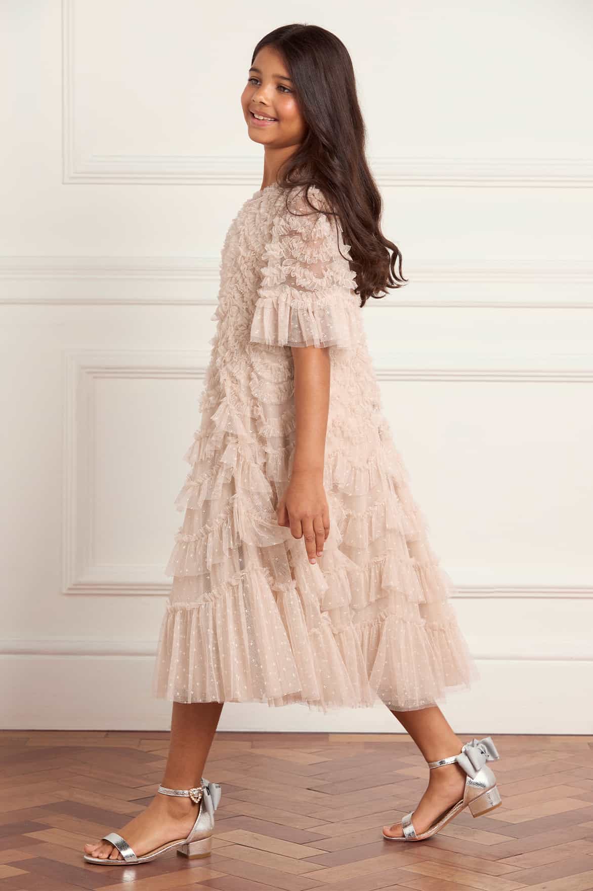 NEW SEASON. The Aviana Kids Dress in Oyster. Crafted in airy layers of tulle, scallop frills cascade across this dress, creating playful movement with every twirl. The soft oyster hue brings timeless charm, while the comfortable fit ensures elegance with ease, perfect for special celebrations. For a coordinated look, pair with the Aviana V-Neck Gown in Oyster from the womenswear collection.