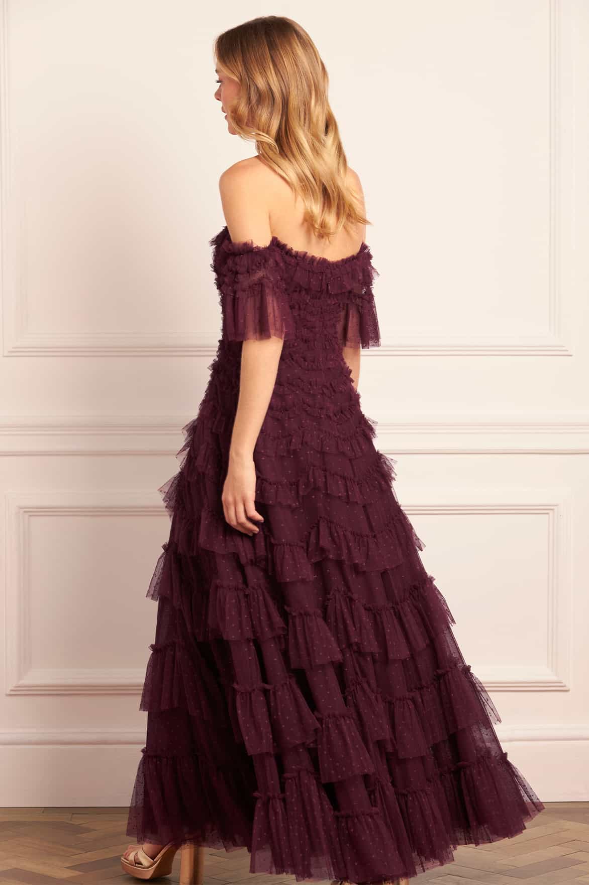 NEW SEASON. The Aviana Off-Shoulder Gown in Claret. A rich reinterpretation of a Needle & Thread signature. Designed with tiered scallop tulle and a romantic off-shoulder neckline, this style blends heritage-inspired textures with a deep wine-red hue.