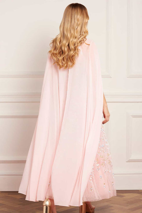 NEW SEASON. The Cressida Floral Cape Ankle Gown in Seashell/Multi. Features exquisite embroidered blooms and a delicate chiffon cape. Designed with raglan seams and soft movement through the skirt, this gown evokes ethereal romance and graceful sophistication.