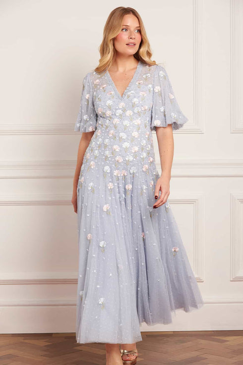 NEW SEASON. The Dandelion Ditsy Ankle Gown in Skylight. Showcases soft floral embroidery that gently fades toward the hem. Crafted from layers of fine tulle, this gown radiates lightness and romantic sophistication. A timeless evening statement.