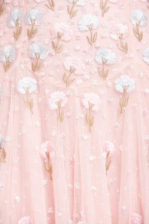 NEW SEASON. The Dandelion Ditsy Halter-Neck Ballerina Dress in Seashell. Showcases embroidered dandelion motifs in soft pink and blue tones. With its halter neckline and layered tulle ballerina skirt, this piece exudes whimsical romance and graceful movement.