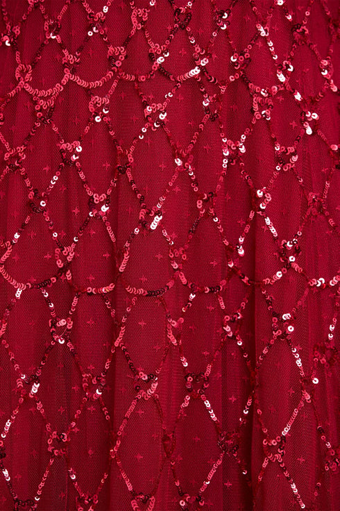 NEW SEASON. The Heart Lattice Ankle Gown in Red. Inspired by the eternal romance of the Bright Star collection, this gown is adorned with embroidered heart motifs entwined within a lattice of sequins, reminiscent of Victorian artwork. Crafted in layers of airy tulle, the fitted bodice and softly flared skirt echo the rhythm of poetry, while the bold red palette amplifies its passion. A gown designed for moments that feel as timeless as the stars.