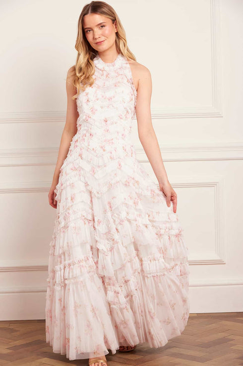 NEW SEASON. The Magnolia Ditsy Elia Halter-Neck Gown in Moonshine/Seashell. Adorned with whimsical floral motifs that scatter across soft tulle. Designed with a halter neckline and timeless ruffles, this gown perfectly balances modern simplicity with romantic detail.