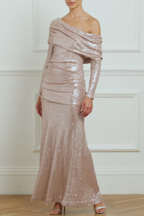 The Nova One-Shoulder Ankle Gown in Rose Gold. This gown is inspired by vintage Hollywood glamour. Beautifully designed with an elegant off-the-shoulder structure. Adorned all over with tiny glittering sequins for the ultimate statement. Crafted with a slim silhouette enhanced by soft drapes across the body, leading to a fluid sweeping skirt. The perfect romantic style for an upcoming special occasion. We hope you adore this new style as much as we do at Needle & Thread head office.