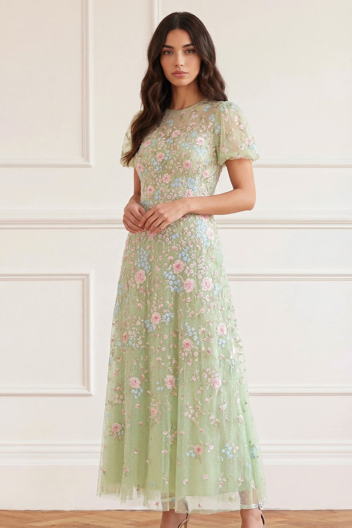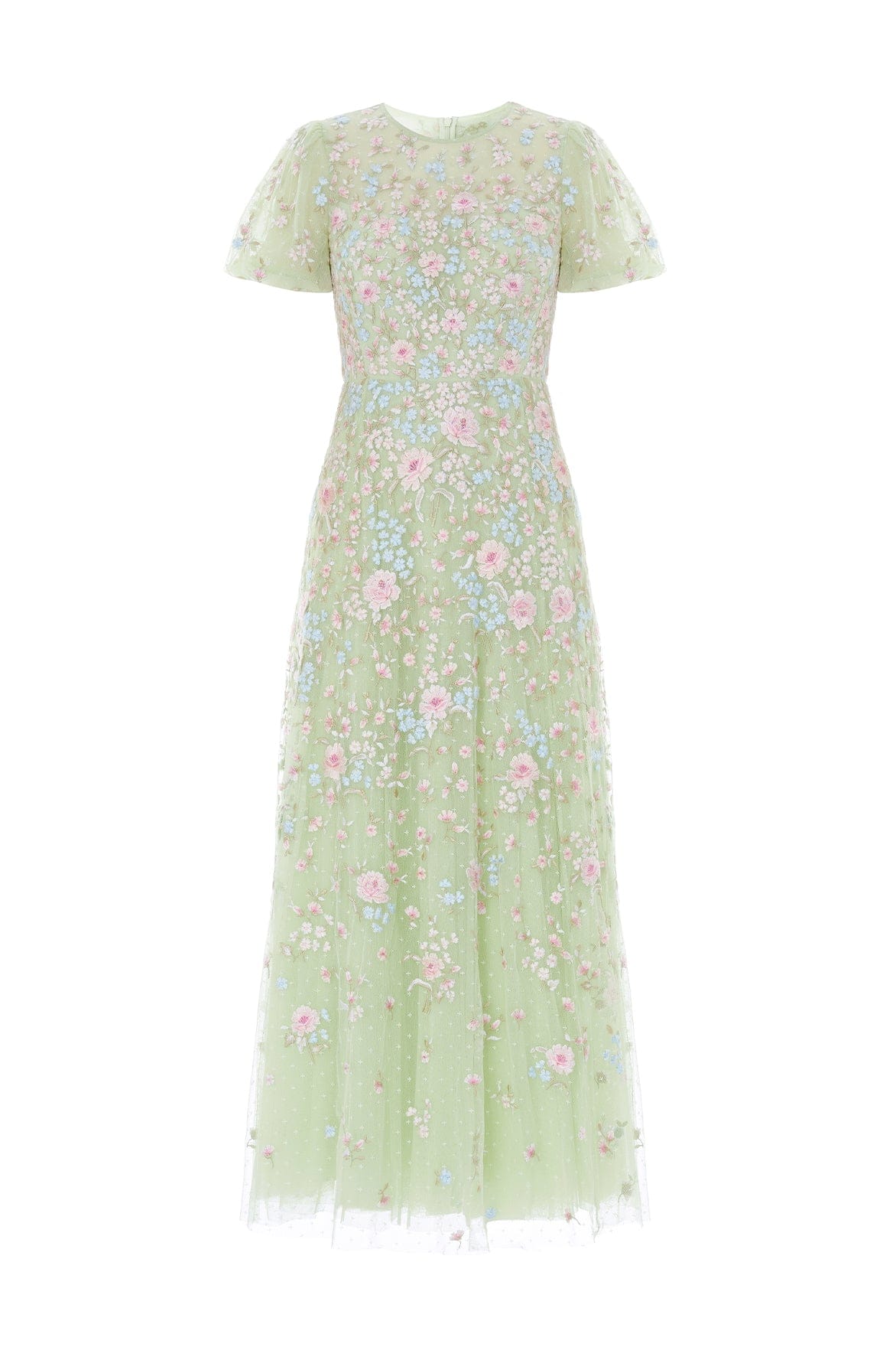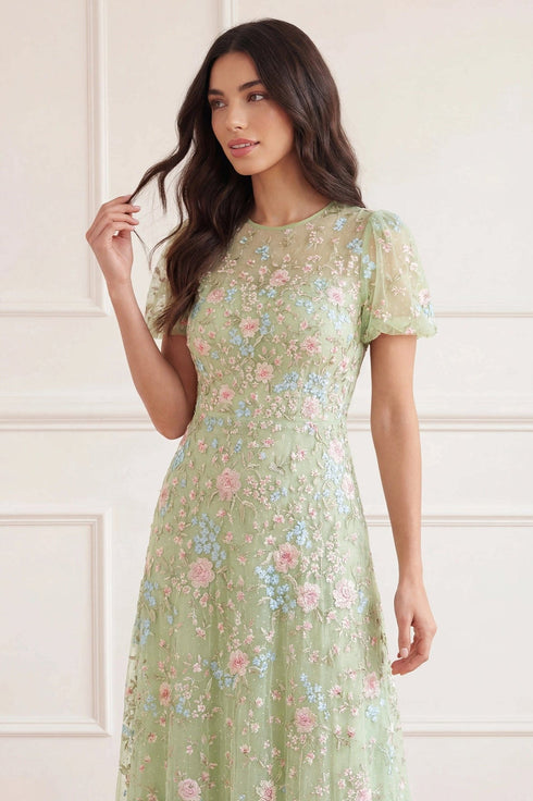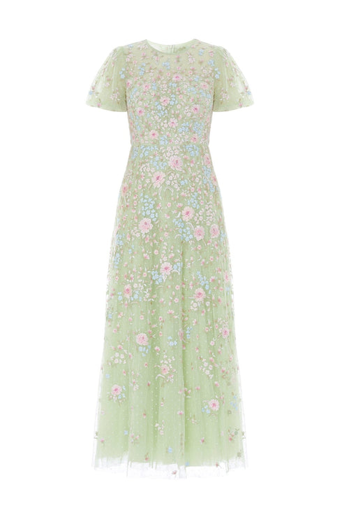 NEW SEASON. The Peony Bouquet Round Neck Ankle Gown in Peppermint/Multi. Exquisite floral embroidery inspired by archival garden paintings adorns this elegant ankle-length gown. Designed with a round neckline and softly flowing silhouette, creating a romantic finish for occasionwear.