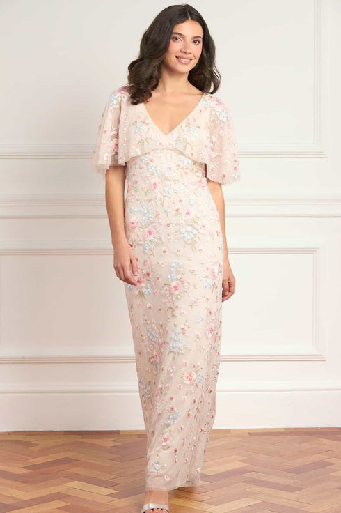 NEW SEASON. The Peony Bouquet V-Neck Cape Gown in Cream/Multi. This elegant gown features exquisite floral embroidery inspired by archival garden paintings. Designed with an integrated cape and a slim silhouette, it is complemented by a bias-cut lining for a smooth, body-skimming fit and effortless wear.