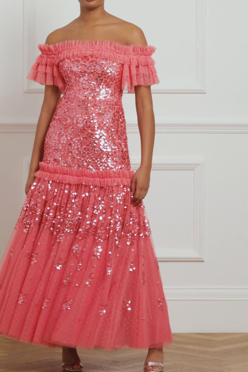 The Regal Rose Off-Shoulder Gown in Pink Sky. A season favourite with an off-shoulder design for the season ahead. This statement gown is developed with a fitted corset bodice flowing into a dramatic, voluminous skirt, creating impact as you walk. The Regal Rose is decorated with an elegant, floral artwork featuring delicate lace. This beautiful design is engineered with layers of our signature Needle & Thread tulle and net, adding a romantic texture. Engineered with an integrated corset made with ribbon stitching, soft boning and panels of stretch mesh fabric for comfort and security in the fit. Take centre stage in this show-stopping piece.
