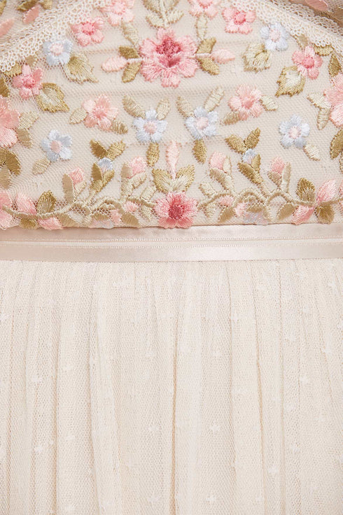 The Ribbon Bouquet Bodice Ankle Gown in Champagne / Pink Multi. The bodice of this gown is intricately designed with embroidered bouquets of flowers in rich tones, inspired by a 1930s vintage print. Beautifully adorned with delicate lace trims for signature Needle & Thread detailing. The skirt features layers of tulle to create a romantic silhouette. The perfect gown for an upcoming occasion.