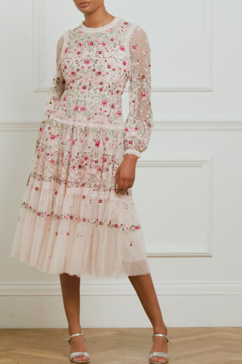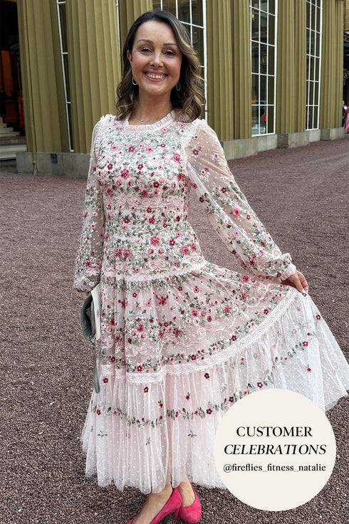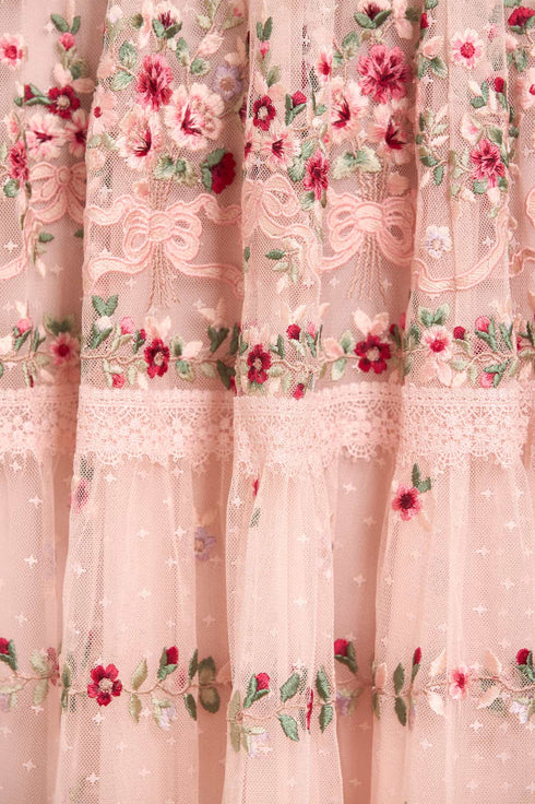 NEEDLE & THREAD EXCLUSIVE. The Ribbon Bouquet Midaxi Dress in Petal Pink. This midaxi dress is intricately designed with embroidered bouquets of flowers in rich tones, inspired by a 1930s vintage print. Beautifully adorned with delicate lace trims for signature Needle & Thread detailing. The skirt is developed with layers of tulle to create a romantic silhouette. The perfect dress for an upcoming occasion.