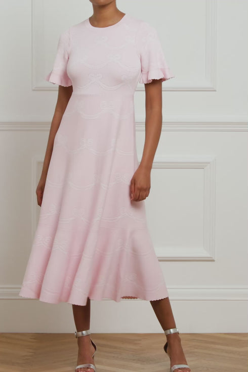 The Ribbon Bow Knit Ankle Gown in Pink / White. This gown is beautifully engineered with ribbon bow motifs creating a pretty and feminine design. Developed from a recycled viscose fabric for a flattering and comfortable fit. Designed with a delicate jacquard pattern framed with pointelle and scallop details. Crafted with a stretch bodice, round neckline and fluted cuffs for signature Needle & Thread elements. Make this gown your new favourite wardrobe staple.