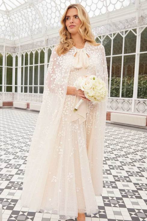 NEW SEASON. The Scatter Blossom Cami Ankle Gown in Cream. Decorated with whimsical tonal embroidery and dainty florals. Crafted from delicate tulle with a softly flared skirt, this romantic gown embodies poetic elegance.