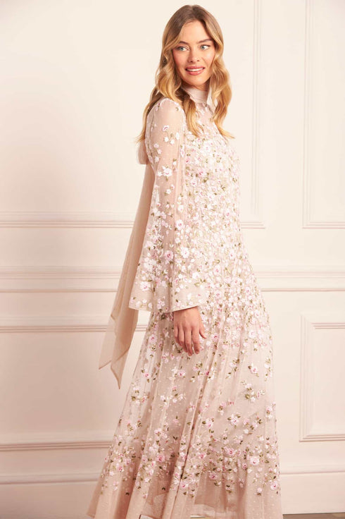 NEW SEASON. The Sylvia Rose Long Sleeve Ankle Gown in Oyster/Multi. Crafted in layers of fine tulle, the gown features long sleeves and a slim, floor-length silhouette and reflects archival florals, through richly embroidered rose motifs scattered with ditsy blooms. The oyster base softens the multi-coloured embroidery, evoking the painterly romance of Victorian design reimagined for today.