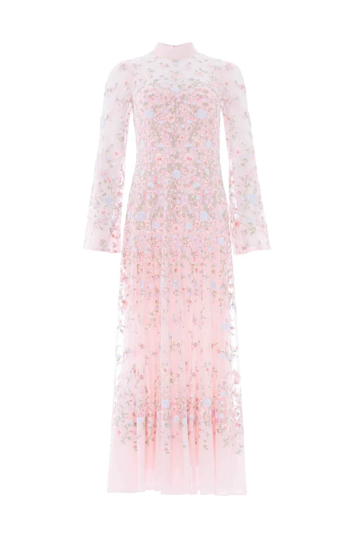 NEW SEASON. The Sylvia Rose Long Sleeve Ankle Gown in Peony Pink/Bright. Adorned with delicate floral embroidery cascading in softly graduated bands, this gown offers a romantic, engineered finish. Designed with long sleeves and an elegant ankle-length silhouette for refined occasion dressing.