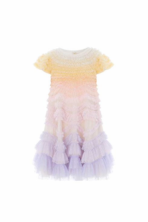 NEW SEASON. The Wild Rose Ombre Kids Dress in Sunset. This dreamy kids dress features a softly blended ombré palette that transitions through warm and cool garden-inspired tones. Designed with a relaxed shape and flowing skirt for beautiful movement. A magical style for a special occasion.