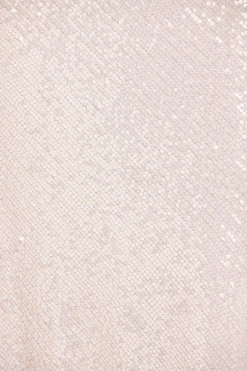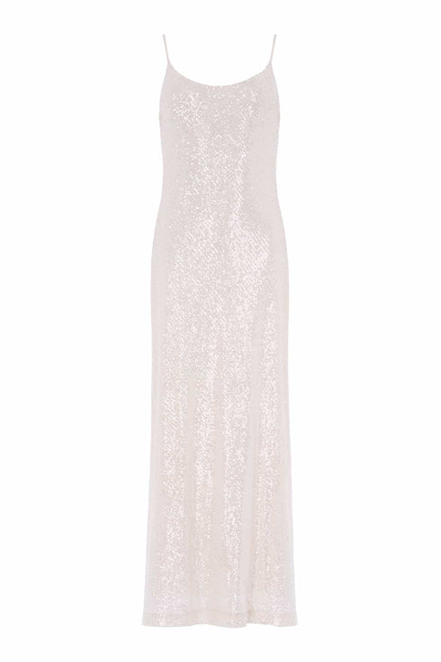 NEW SEASON. The Yvonne Sequin Cami Gown in Cream. Cut on the bias for an elegant, fluid fit. Crafted from stretch mesh adorned with high-shine sequins, this gown shimmers beautifully with every movement, creating a luxurious, show-stopping finish.