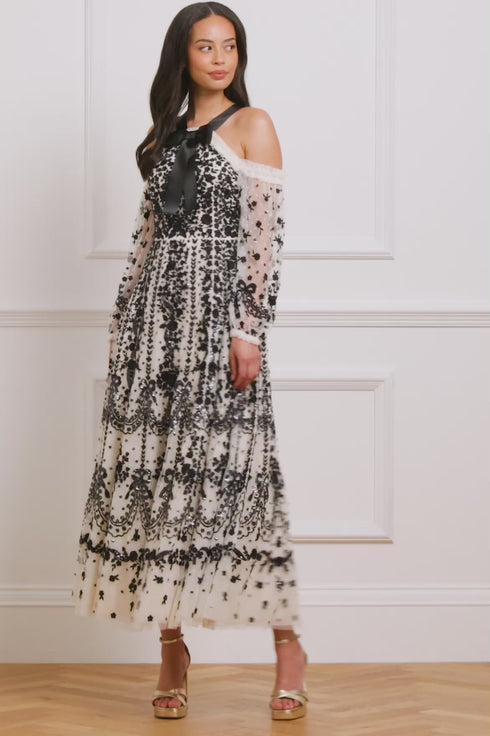 The Adeline Off-Shoulder Ankle Gown in Cream/Graphite. A dramatic take on evening elegance. Delicately embroidered with Victorian-era inspired florals, bows and scallops in contrast graphite thread, this off-shoulder silhouette embraces romance with a contemporary twist. Shimmering sequin embellishments enhance the flattering fitted bodice, while the ankle-length skirt flows into a cascade of softly glinting florals.