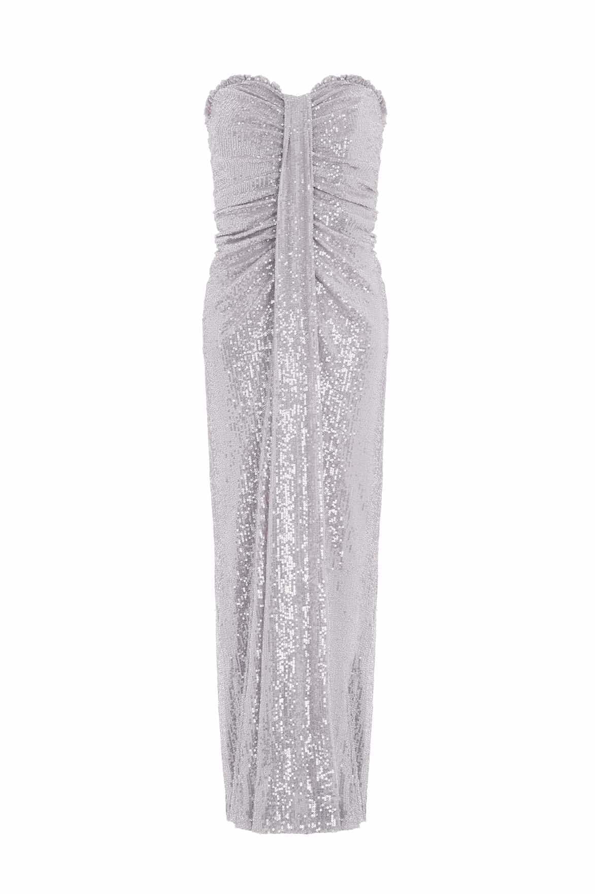NEW SEASON. Amora Strapless Ankle Gown in Dove/Silver. A radiant design infused with celestial romance. Cut in a strapless silhouette, the gown is embroidered with glistening silver sequins across layers of soft dove-grey tulle, evoking starlight on a moonlit sky. The fitted bodice flows into a gently flared skirt, balancing structure and lightness. A gown designed for memorable celebrations.