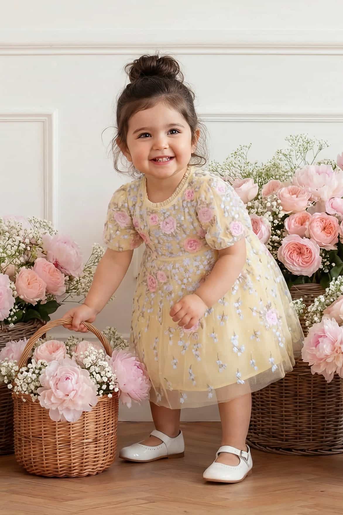NEW SEASON. The Cressida Embroidery Baby Dress in Lemon Sorbet/Multi. Features tonal floral embroidery across a soft pastel tulle base. With flutter sleeves and a comfortable fit, it captures timeless Needle & Thread charm.