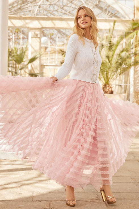 The Crystal Border Short Cardigan in Cream. This soft wool cardigan is decorated with delicate crystal embellishment, faux pearls, and diamante floral motifs creating feminine detail. Crafted with signature Needle & Thread scallop details, twisted cable stitch, and a ribbed neckline. Developed with slim fit sleeves, short in body length and a fitted silhouette. Make this cardigan your new wardrobe staple.