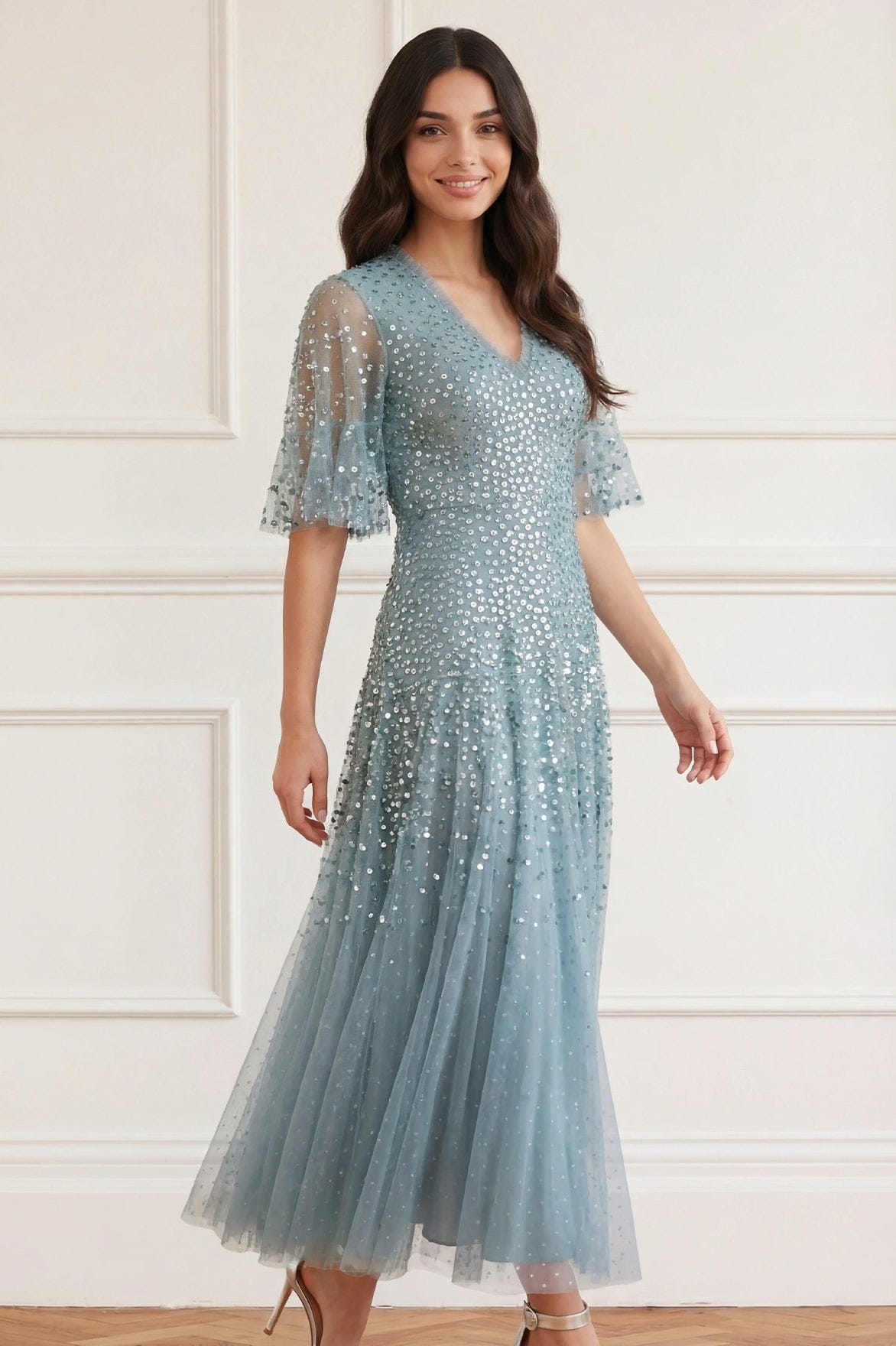 The Dappled Sequin Cape Ankle Gown in Thistle Blue. A graceful romantic design, this ethereal gown features an integrated cape with softly gathered frill detailing, adding fluid movement and a touch of drama. Crafted with delicate clusters of shimmering sequins intricately scattered across the fabric, creating a light-catching, dappled effect. Designed with signature Needle & Thread tulle ruffles framing the neckline, while chevron seaming sculpts the waist and hips before falling into a voluminous, frothy skirt. Crafted from generous layers of net and tulle, this gown is destined for truly unforgettable moments.