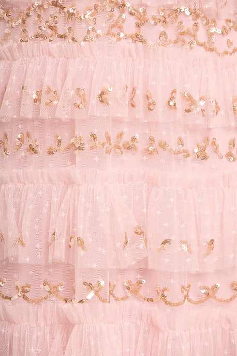 The Emily Lace Ankle Gown in Dusk Pink/Caramel. This ethereal gown is adorned with delicate sequin embellishments, arranged in intricate border designs that capture the essence of vintage romance. Developed with signature Needle & Thread tulle frills cascade down the gown, gradually increasing in size as they reach the hem, each one adorned with glittering sequins for a captivating sparkle. Crafted with romantic fluted sleeves, featuring a delicate leaf motif and frills at the cuff, adding a touch of charm to this timeless piece. Designed for elegance and comfort, the gown boasts a loose-fit silhouette with perfectly proportioned gathered tiers, offering a flattering and effortless wear. Whether for a special occasion or a moment that calls for something truly unique, the Emily Lace Ankle Gown is a breathtaking choice that combines vintage inspiration with contemporary luxury.