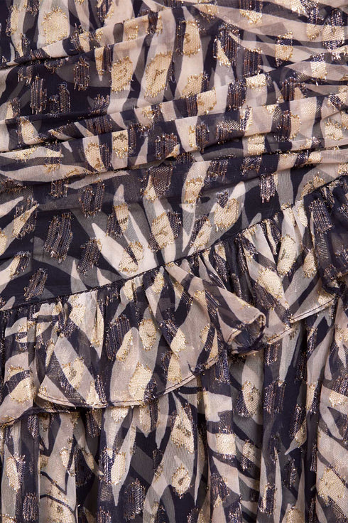 The Feather Lurex One-Shoulder Ankle Gown in Midnight/Beige. This ankle gown features a gold feather lurex print inspired by costumes worn by the Follie’s dancers of the early 1900s. The feather print is hand-painted in-house creating a subtle watercolour effect. This playful one-shoulder dress boasts a flattering gathered ruche detail engineered across the body and adorned with signature Needle & Thread frill detailing. Designed with a blouson sleeve featuring a ruffle cuff and romantic frills. The slim silhouette includes a dropped waist seam with a flirty frill tier. The stretch lining fabric ensures fit and comfort.