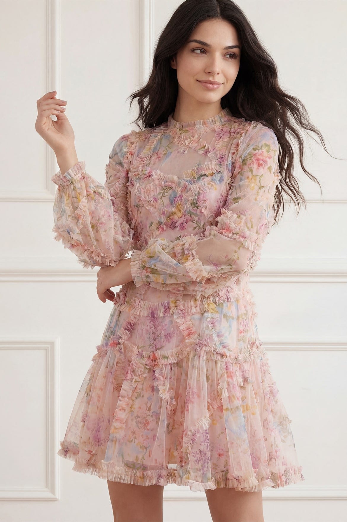 Floral Diamond Ruffle Dress in Topaz Pink. This eye-catching piece is crafted from delicate ruffled tulle with an all-over vintage print taken from an early 1900's hand-painted fabric design. A romantic look featuring voluminous cuffed sleeves and a flattering skirt that skims the body to gently increase in fullness, creating stunning movement within the tulle. This Victorian-inspired look with a contemporary edge will be the star of your wardrobe.