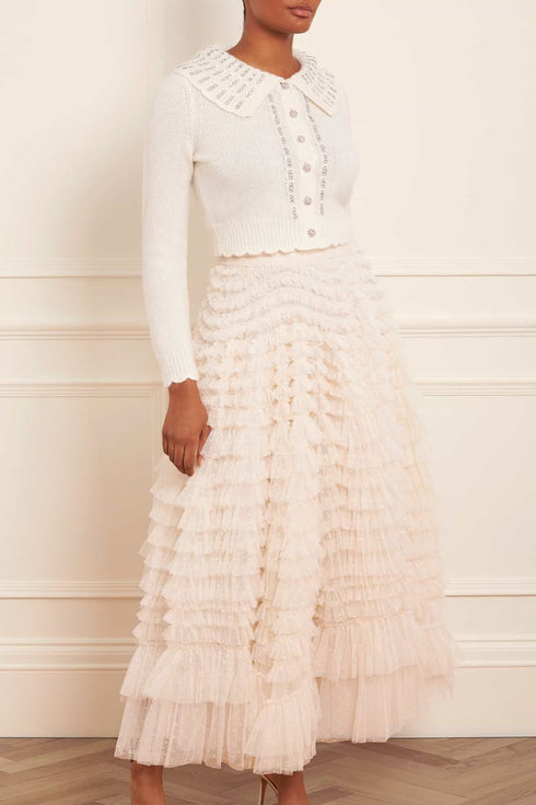 The Hattie Ruffle Skirt in Cream. This textile skirt is engineered with layers of soft tulle and net to create a signature Needle & Thread style. Crafted with individual ruffles to create a beautiful, frilly texture. Designed with a sweeping hemline and finished at the waist with a satin ribbon for extra detail. We recommend pairing this skirt with our knitwear for a romantic Needle & Thread look.