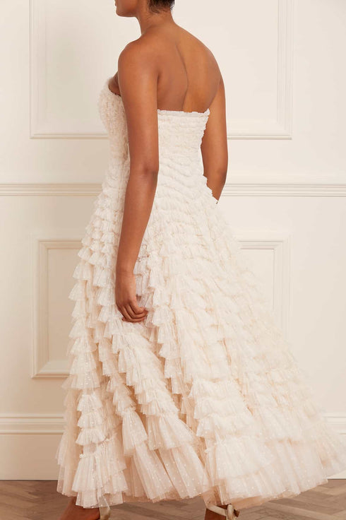 The Hattie Ruffle Strapless Ankle Gown in Cream. This gown is elegantly developed with layers of frothy tulle creating a soft, wavy textile. This strapless gown features signature Needle & Thread ruffles and frills for intricate, romantic detailing. Make the ultimate statement in the Hattie at your next event.