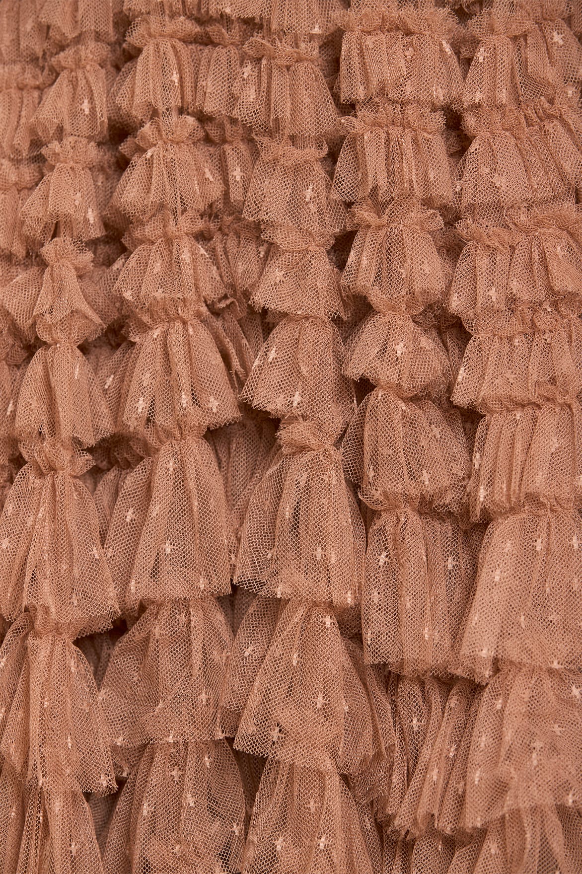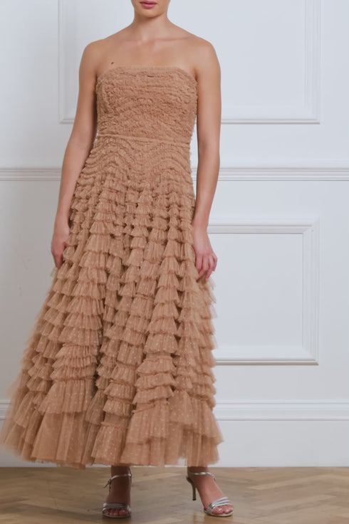 The Hattie Ruffle Strapless Ankle Gown in Mocha. This gown is elegantly developed with layers of frothy tulle creating a soft, wavy textile. This strapless gown features signature Needle & Thread ruffles and frills for intricate, romantic detailing. Make the ultimate statement in the Hattie at your next event.