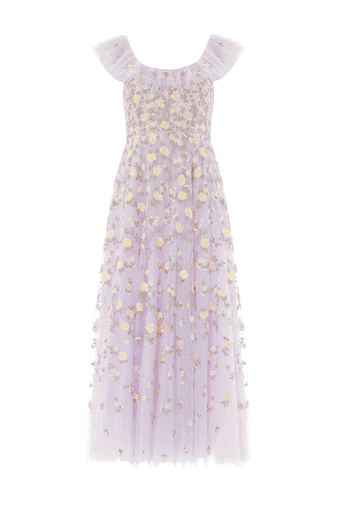 NEW SEASON | NEEDLE & THREAD EXCLUSIVE. The Lea Ditsy Ankle Gown in Powder Lilac/Lemon Sorbet. This elegant gown is adorned with delicate ditsy florals inspired by early 1900s garden paintings. Designed with a flowing ankle-length silhouette, trailing leaves and soft florals create a timelessly romantic effect.