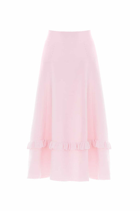The Pointelle Trim Knit Skirt in Pink. This beautifully crafted skirt features intricate pointelle stitching, delicately adorning the hem and soft frill for a feminine, romantic finish. A flattering stretch waistband ensures both comfort and shape, while decorative pointelle detailing along the vertical seams adds subtle texture and elegance. Finished with a finely knitted scallop edge at the hem, this piece blends timeless craftsmanship with modern charm—perfect for elevated everyday styling or special occasions. Style with the Pointelle Trim Knit Short Cardigan for a beautifully coordinated look.