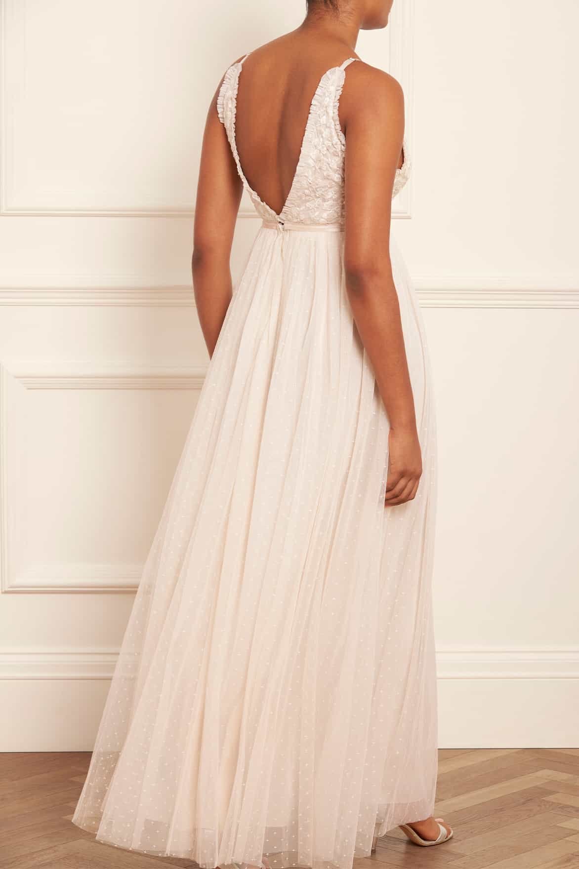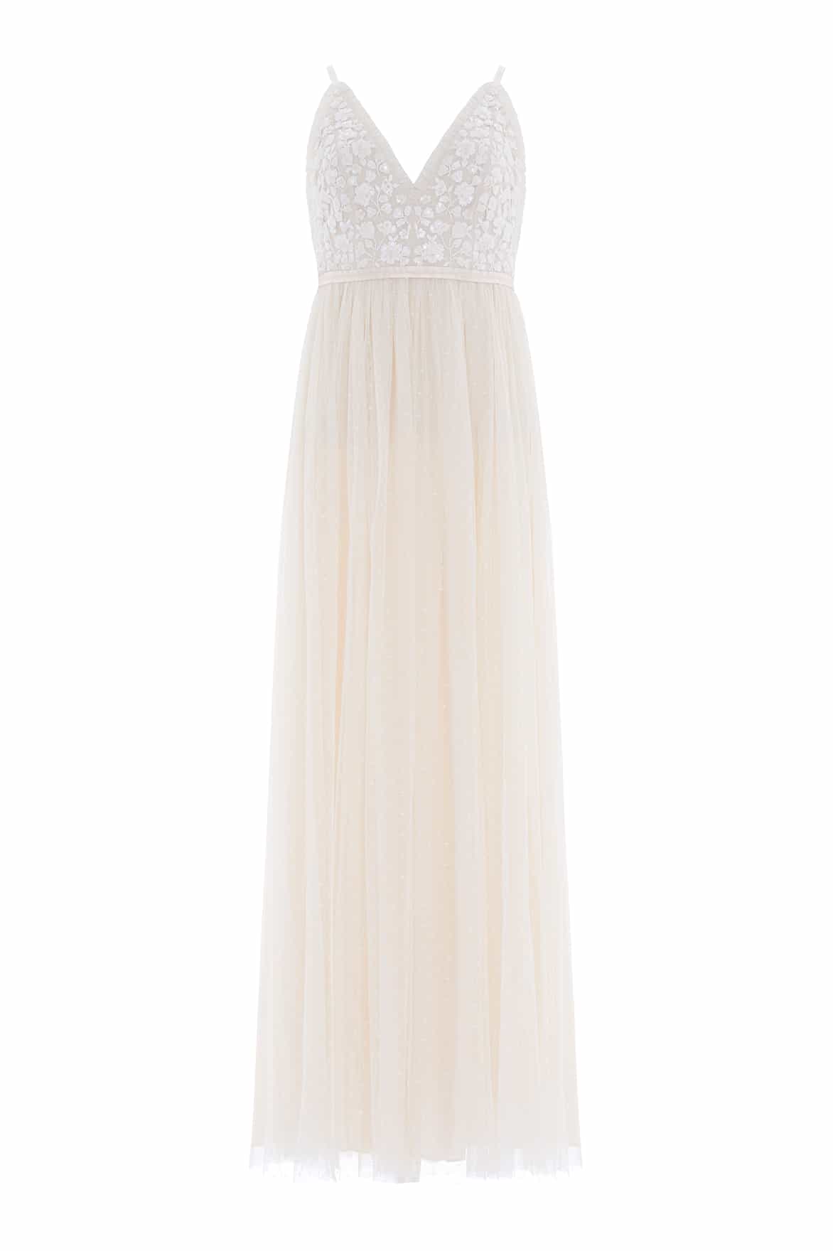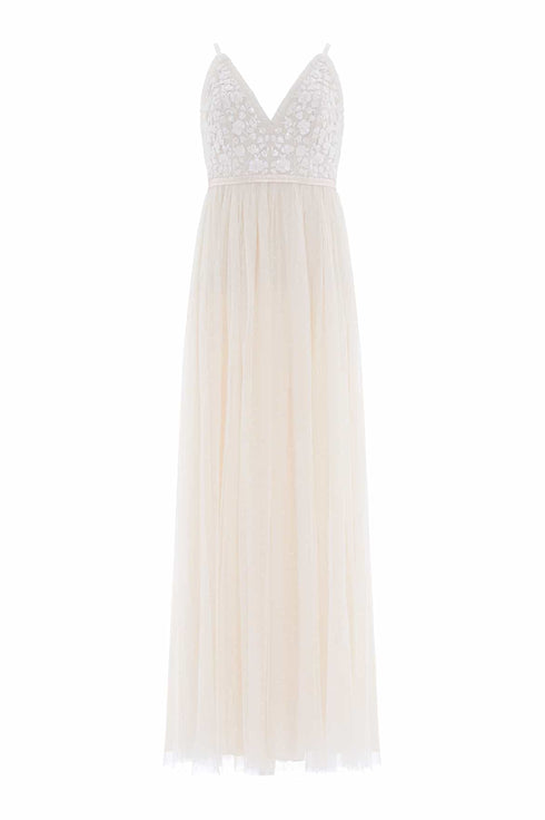 NEEDLE & THREAD EXCLUSIVE. The Posy Cami Gown in Cream. This gown is adorned beautifully with clusters of intricate floral bouquets and shimmering sequins for a sparkling effect. The skirt is developed with layers of signature Needle & Thread soft tulle for a romantic look. A simple but yet striking gown you'll forever treasure.