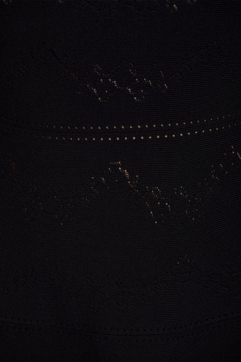 The Pretty Pointelle Knit Scoop Neck Mini Dress in Black. A brand new style for Needle & Thread. This knitted dress is inspired by vintage ditsy florals and lace. Beautifully designed with all-over pretty pointelle stitch, delicate florals and scallop details. This dress has a fitted stretch bodice with a soft, feminine neckline, fluted cuffs and signature Needle & Thread detailing. A truly flattering piece.