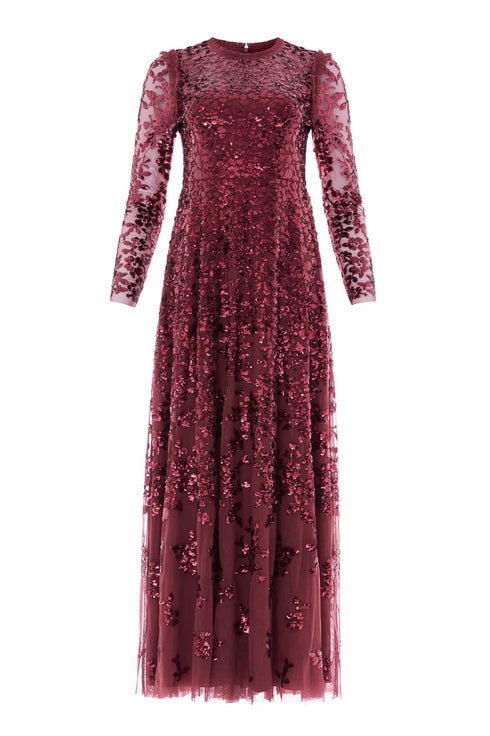 NEW SEASON. The Rosanna Lattice Round Neck Gown in Winterberry. Romantic and striking, this gown reimagines archival florals for a modern muse. The bodice is embroidered with dense sequin florals that transition into an ornate lattice before softening into scattered sequins toward the hem. Crafted in layers of lightweight tulle, the gown flows with movement. The winterberry palette intensifies its richness, evoking the depth of night skies in the Bright Star story.