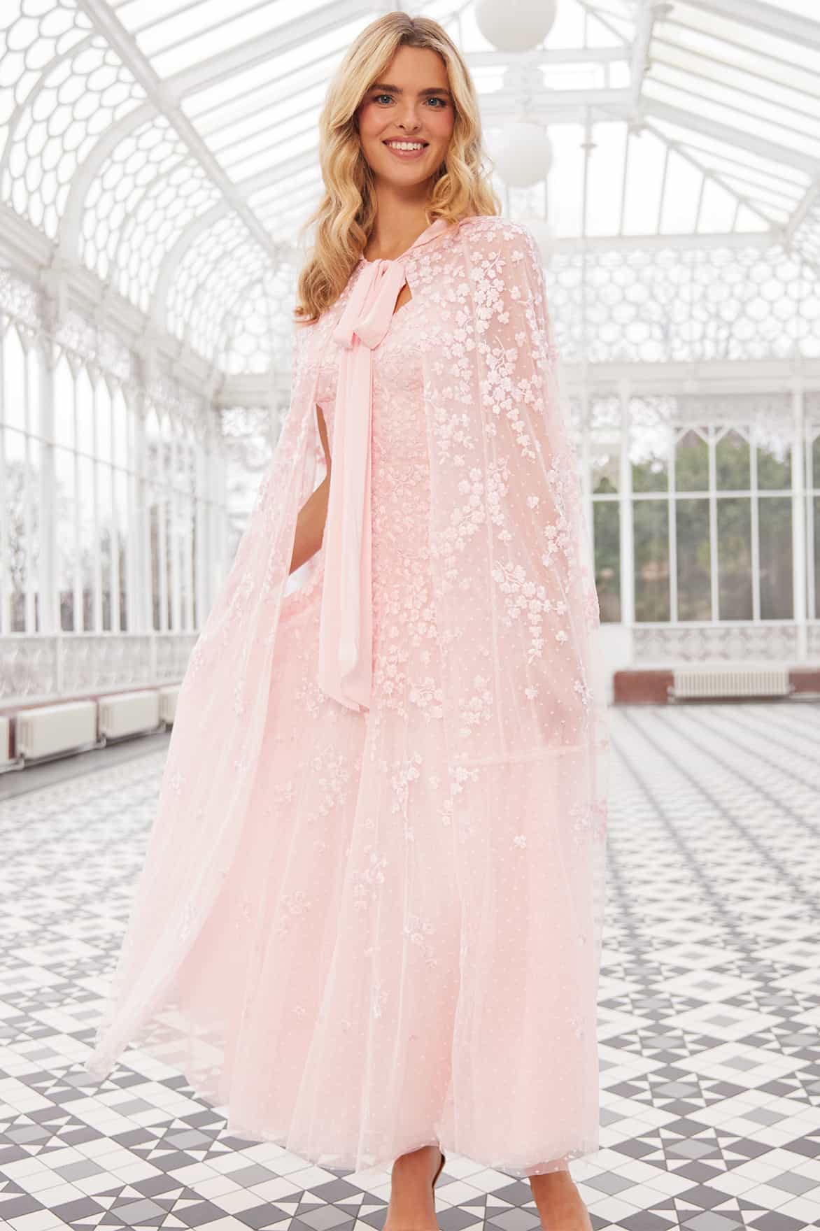 NEW SEASON. The Scatter Blossom Cami Ankle Gown in Seashell. Decorated with tonal embroidery of delicate ditsy florals. Crafted from airy tulle, this gown flows gracefully for a soft, romantic finish.