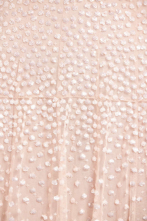 NEW SEASON. The Sequin Cascade Long Sleeve Ankle Gown in Oyster. Long sleeves balance a slim, fluid silhouette, embroidered with sequins that scatter downwards like falling stars. Crafted in delicate tulle with soft lining, this gown captures the luminosity of moonlit skies. It feels timeless and romantic, ideal for unforgettable moments.