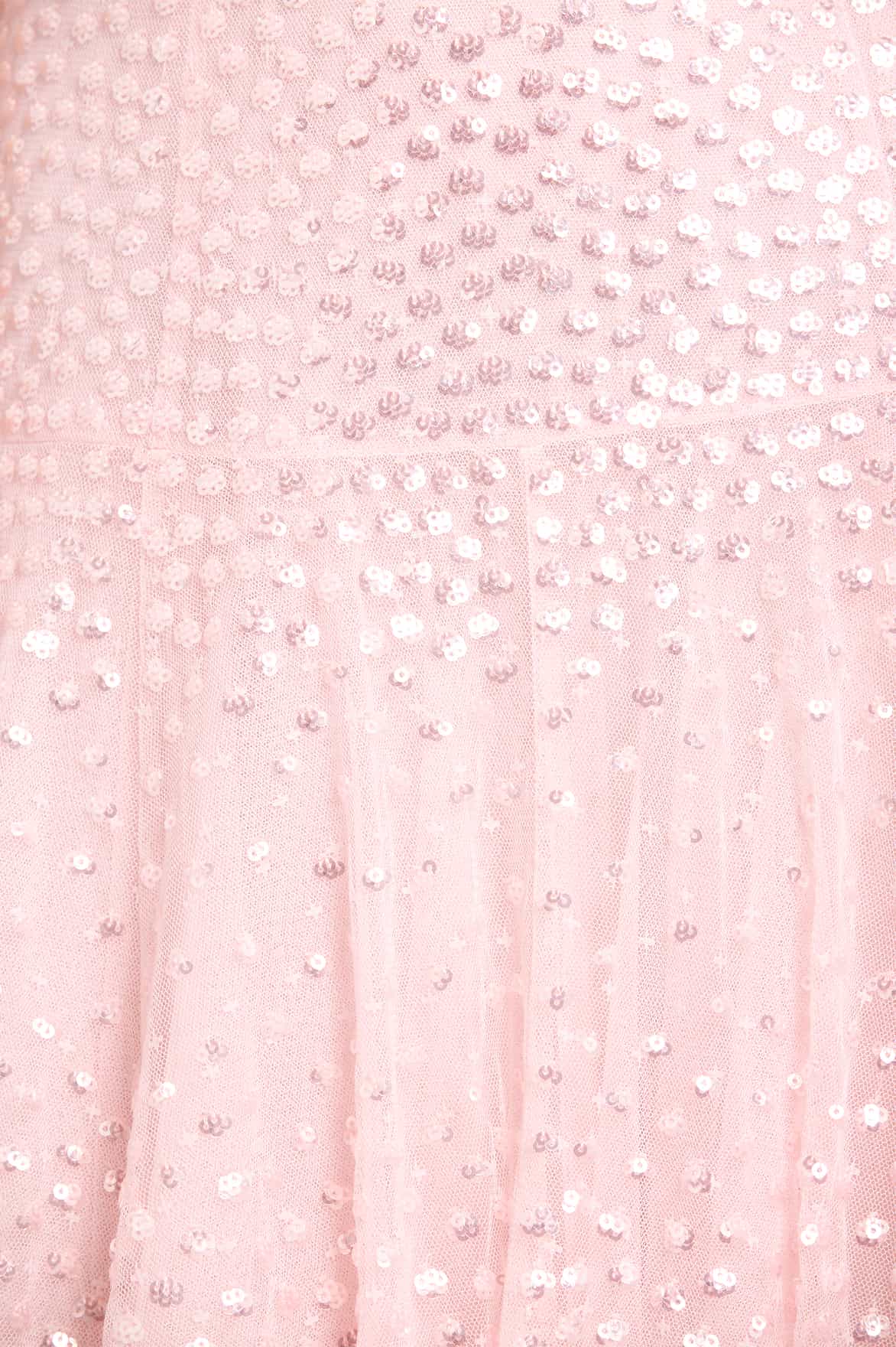 NEW SEASON. The Sunrise Sequin Strapless Cape Gown in Peony Pink. An elegant strapless gown adorned with softly shimmering sequin detailing inspired by glowing sunrise hues. Finished with a delicately gathered tulle cape at the back and a flowing full-length skirt for dramatic occasionwear. Perfectly paired with a matching scarf.