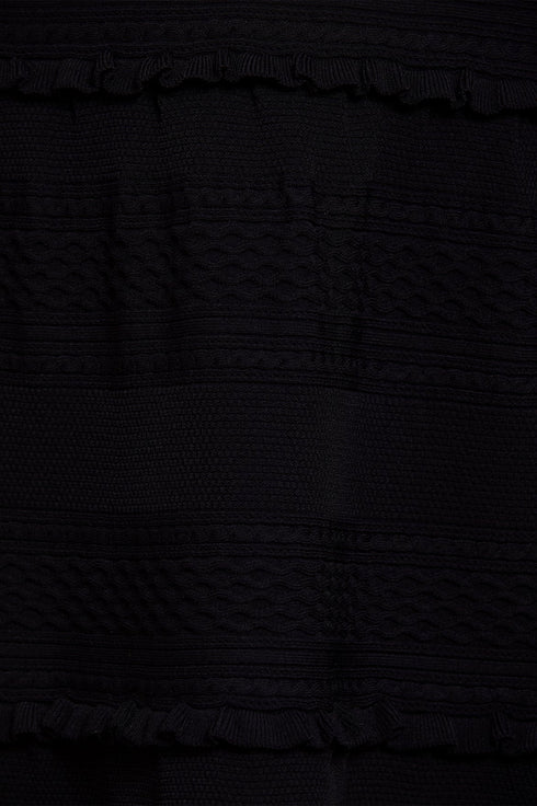 The Textured Knit Sleeveless Mini Dress in Black. This knitted dress is intricately designed with scallop and pointelle trims for signature Needle & Thread detailing. Beautifully developed from a stretch, yarn fabric that makes the dress easy to wear and comfortable. This sleeveless dress is adorned with perfectly placed knitted ruffles, lace cable details and a voluminous skirt. Make this dress your new wardrobe staple.