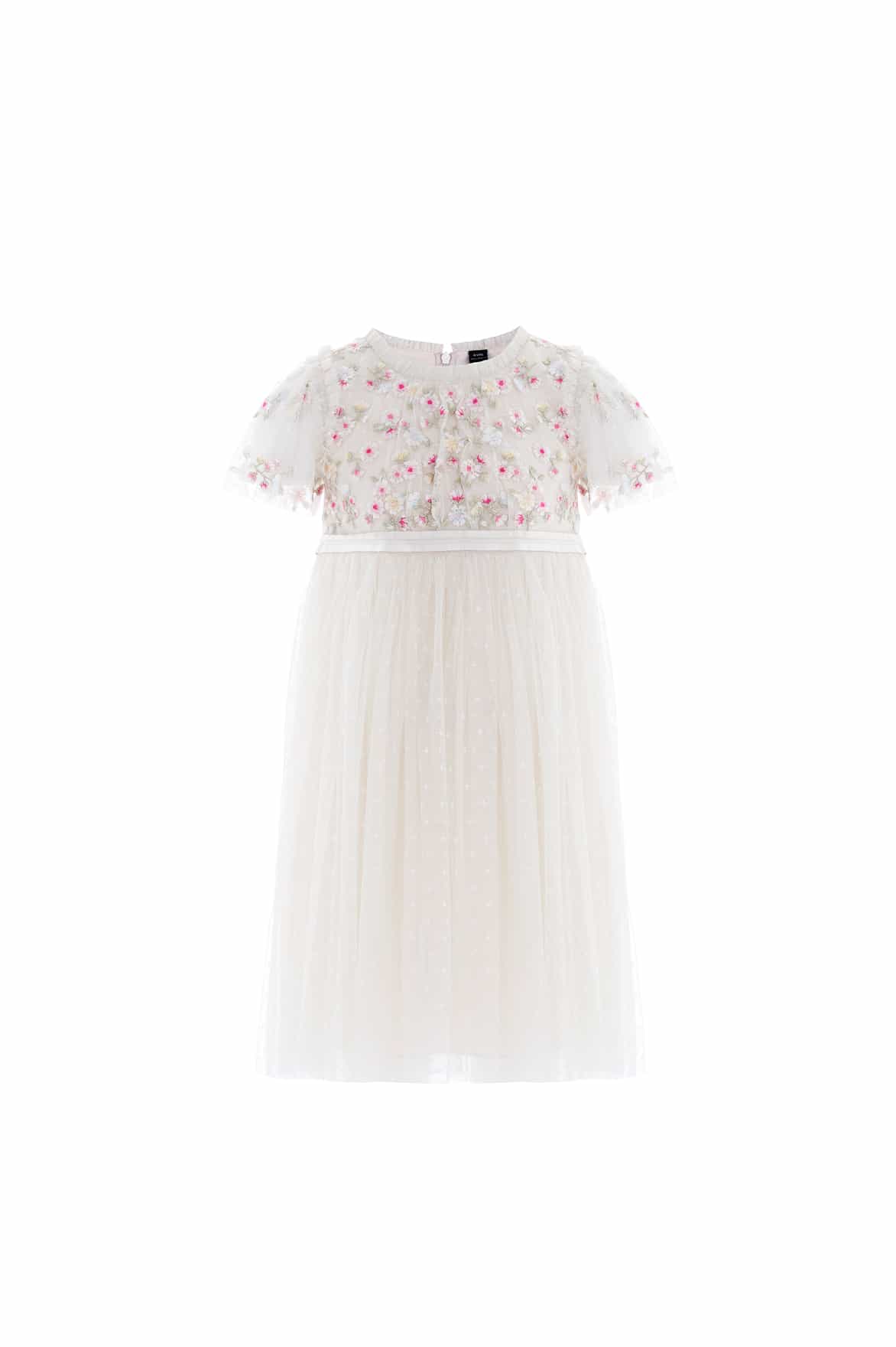 NEW SEASON. The Wildflower Ditsy Bodice KIDS Dress In Cream/Azalea Pink. The bodice of the dress is embroidered with floral motifs in soft, pastel shades inspired by floral garden paintings. Developed with a soft tulle skirt creating playful movement as she walks. Let your little one twirl around in the Wildflower at her next event.